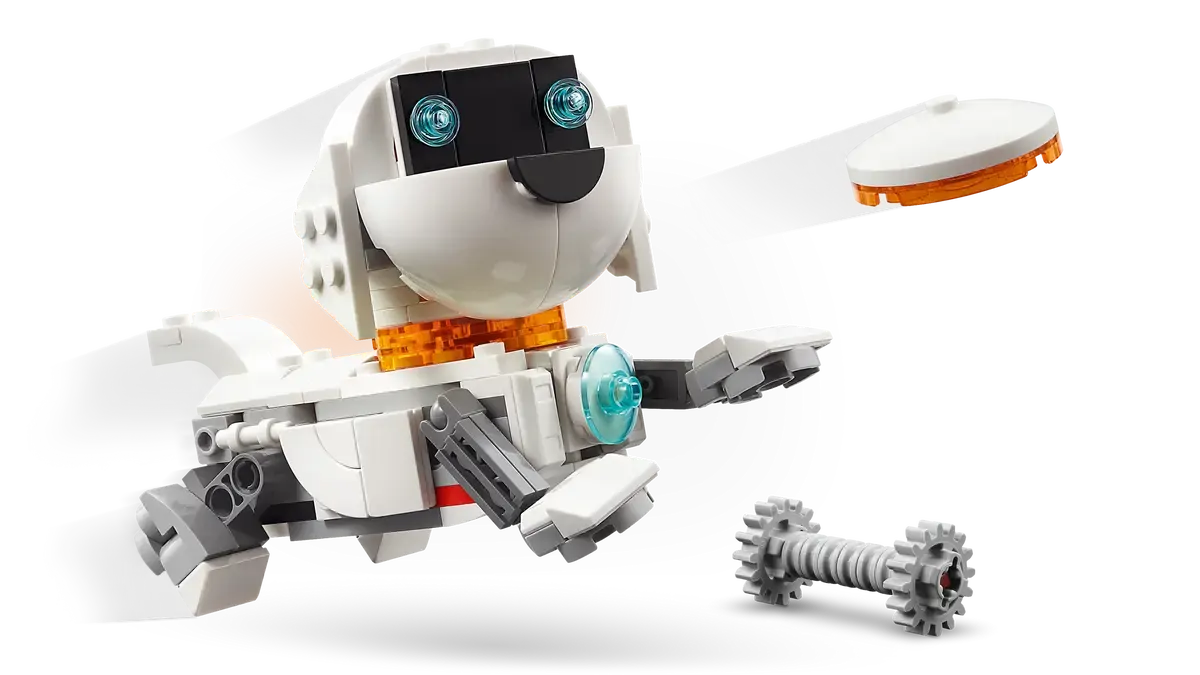 LEGO fans build and rebuild 3 different action-packed space playsets with the same bricks: a robot toy on moving tracks; a posable space dog figure with a bone and a flying disc; or a space rocket. All 3 models are cool space-themed gifts for play and display and illuminate when kids press down on a light brick (batteries included).