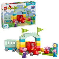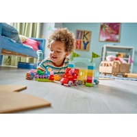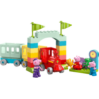 Toddlers ages 2 and up embark on an exciting learning journey with the Peppa Pig Train Ride with Grandpa Pig (10466) building toy. It comes with 3 characters – Grandpa Pig, Peppa Pig and George Pig – a drivable toy train with 2 carriages, an arch made from bricks and a LEGO® DUPLO® station with chairs and a clock. This educational gift can help toddlers’ skills grow as they play. They can learn that they must be patient waiting at the station for the train. Then with their fine motor skills they can place the Teddy and Mr. Dinosaur toys into the hands of the George and Peppa Pig figures to ensure they board safely before setting off. Toddlers can use hand-eye coordination and stacking skills to assemble the toy bricks into an archway. For extra learning, toddlers can then sort the bricks into carriages of matching colors. LEGO DUPLO Peppa Pig learning toys let toddlers develop early skills while recreating scenes from their favorite show. Set contains 35 pieces.