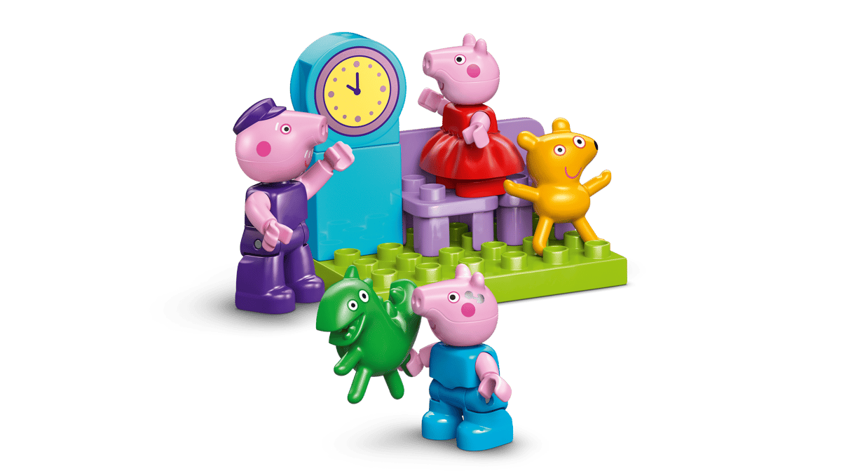 - 3 PEPPA PIG CHARACTERS – Toddlers watch the clock and wait for the train, then join Peppa and George Pig, and their toys, Teddy and Mr. Dinosaur, onboard as Grandpa Pig drives the train