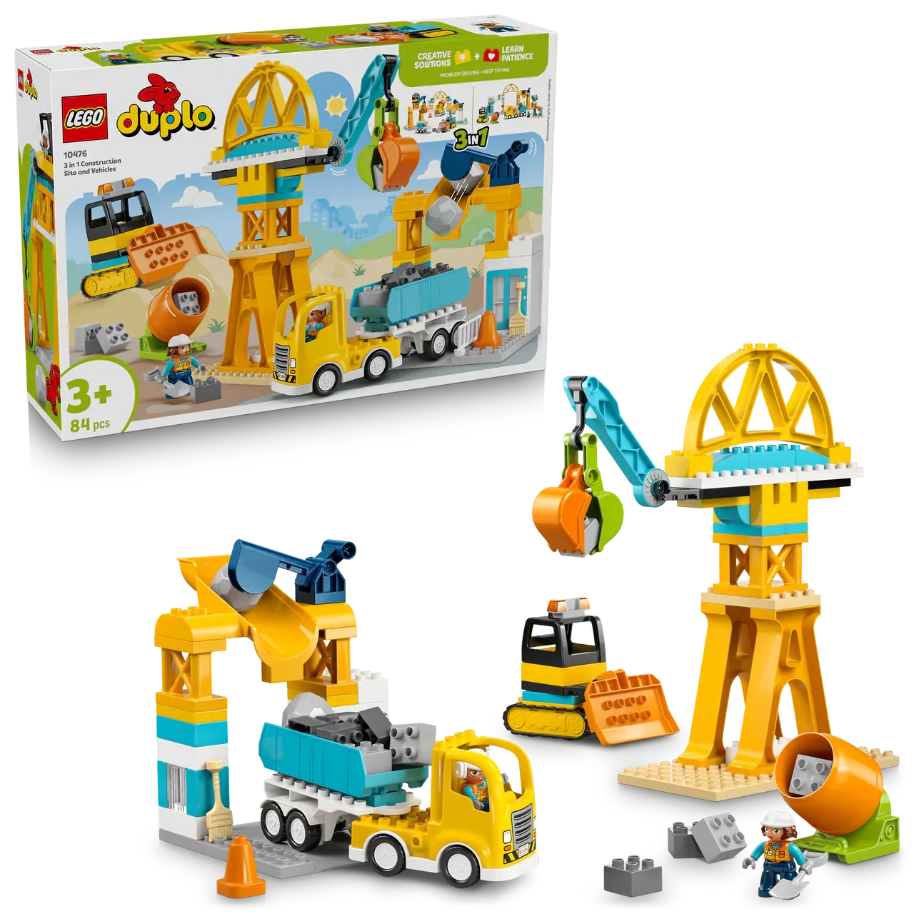 - LARGE CONSTRUCTION TOY FOR TODDLERS – This 3 in 1 Construction Site and Vehicles (10476) set includes 2 figures and 84 bricks to make lots of LEGO® DUPLO® Town truck toys and building options