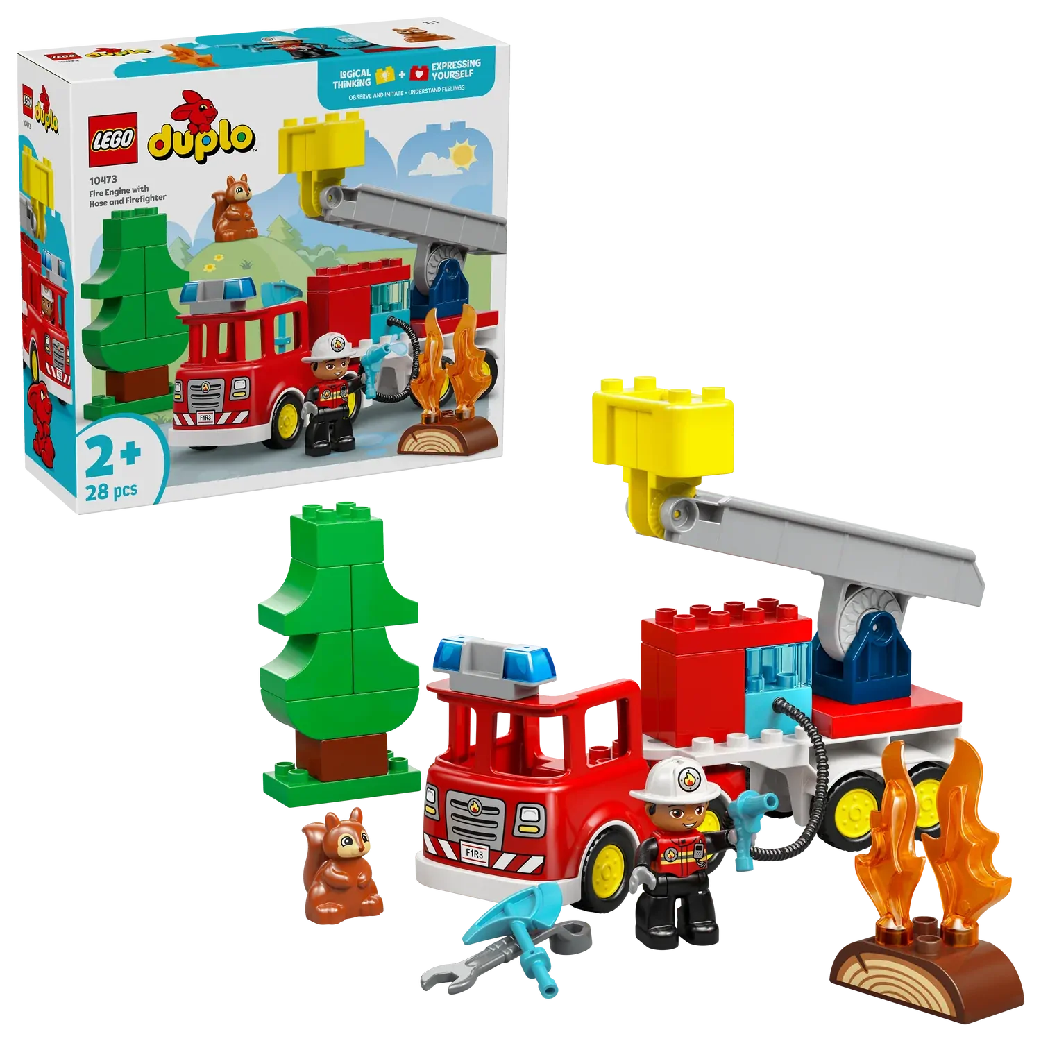 - PACKED WITH FUN FEATURES – Includes a fire engine model with detachable trailer, a firefighter figure, LEGO® DUPLO® squirrel, axe and wrench to encourage imaginative save-the-day play