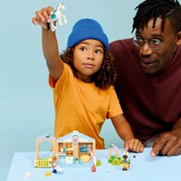 The toy set includes Leo and Valeria minidolls, plus a horse, a dog, a bunny and 2 cat figures. Vet-themed accessories such as a syringe, a thermometer and a clipboard and pen inspire make-believe play. For the horse, there’s a saddle, hay, a brush, a carrot, water, horse poo, and a helmet for a rider.