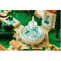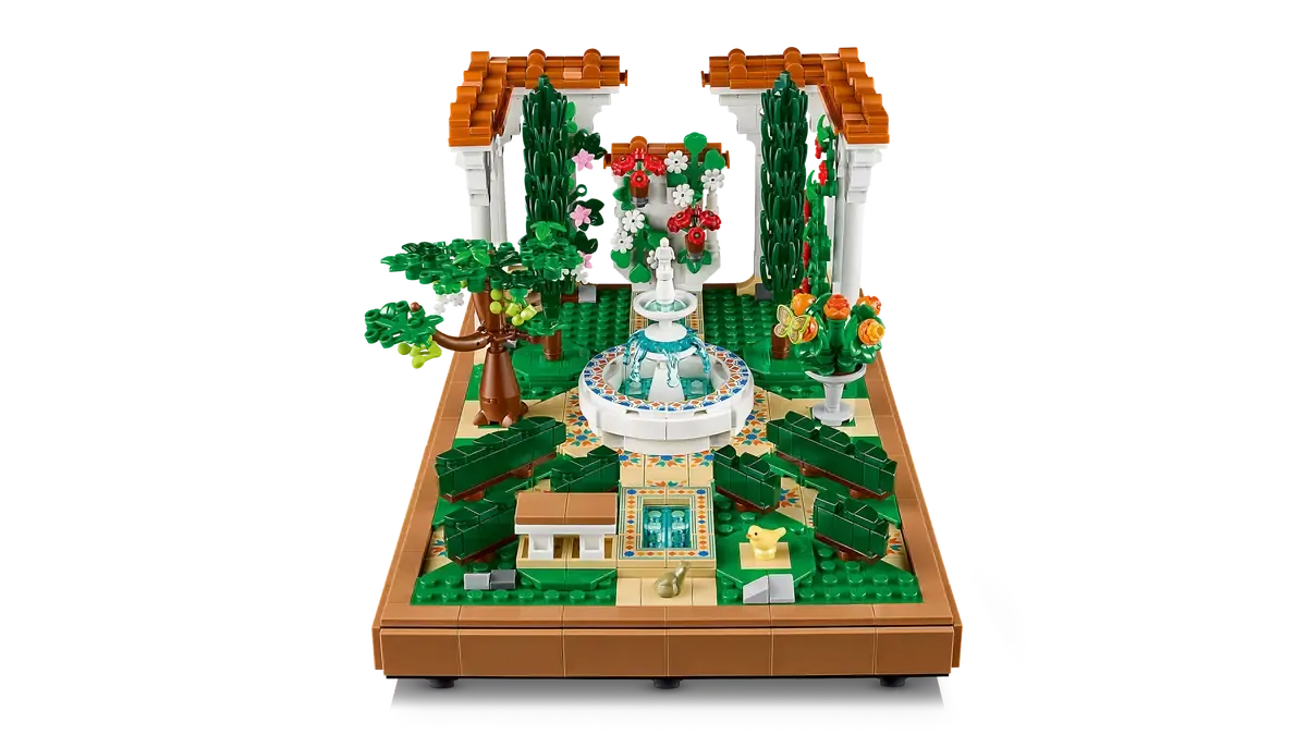 - What’s in the box – The LEGO® Fountain Garden features a tiered fountain, lavabo, 2 cypress trees, flowering grapevines, 4 pergolas and tiled pathways, plus luna moth, bird and frog figures