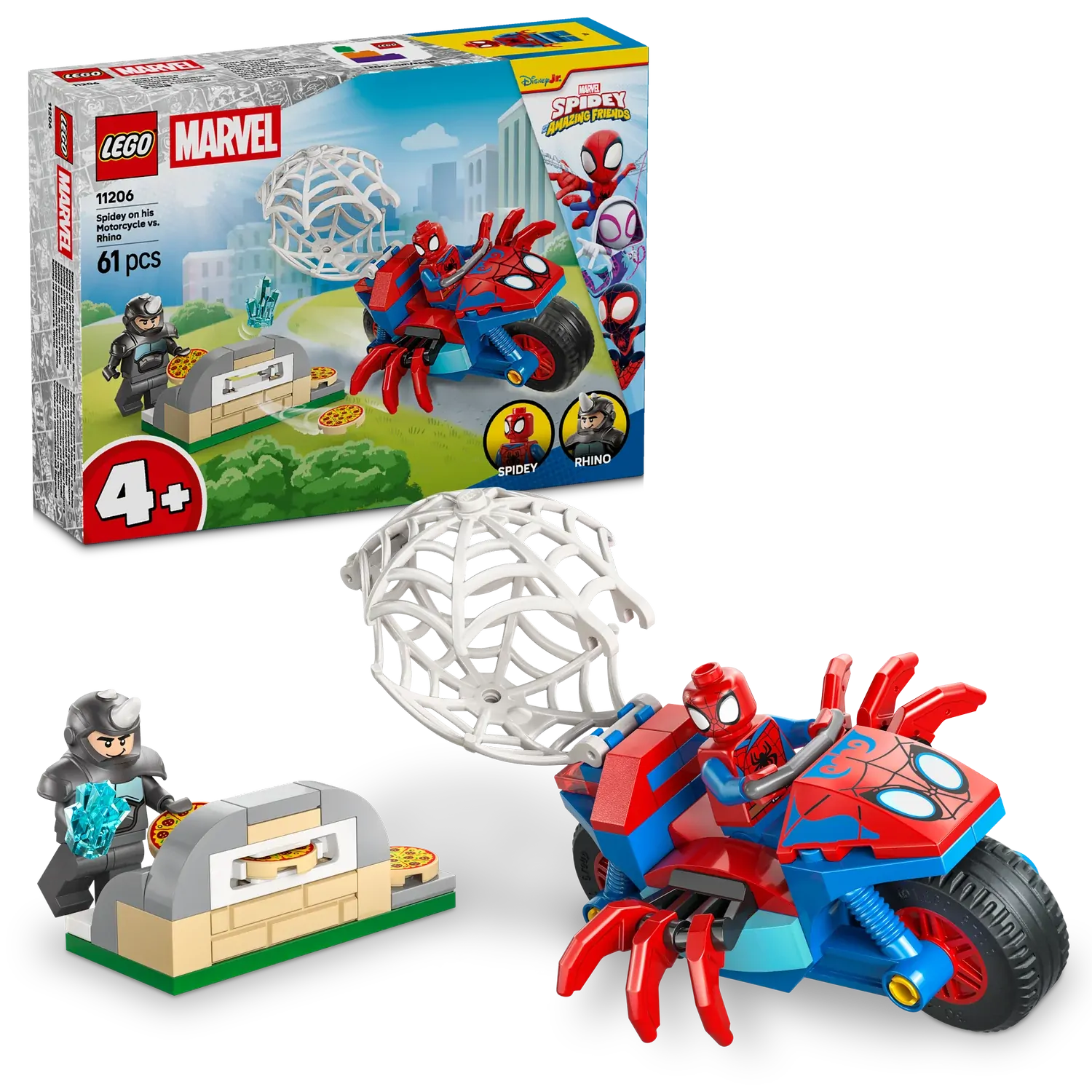 - MARVEL ACTION ON WHEELS – Kids help Spidey retrieve a stolen blue gem, dodge flying pizzas launched from Rhino’s pizza oven shooter, and capture Rhino in a giant spiderweb trap