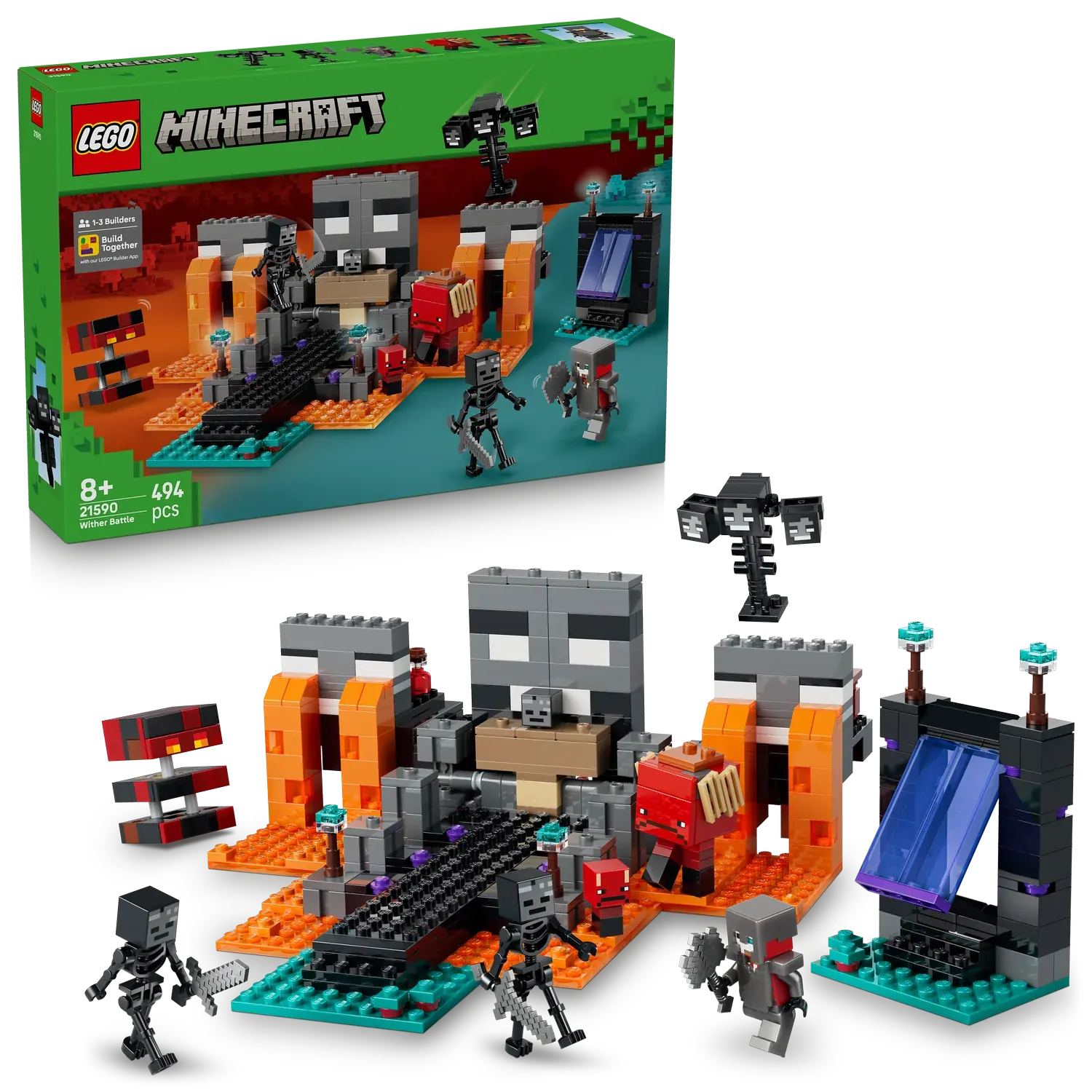 Packed with action and authentic Minecraft details, this set includes gaming characters like a Crimson Warrior, 2 wither skeletons, a strider, a magma cube and a buildable wither boss. A Nether portal and a shrine with a crafting table and a hidden wither that kids can summon with an explosion feature bring the game to life. Kids enjoy imaginative, hands-on play as they battle foes, ride the strider and engage in epic adventures – making it a great gamer gift for Minecraft players, LEGO builders and fans of video game toys. And friends and family can team up with Build Together mode in the LEGO Builder app, where everyone has fun building part of the set using their own devices. Set contains 494 pieces.