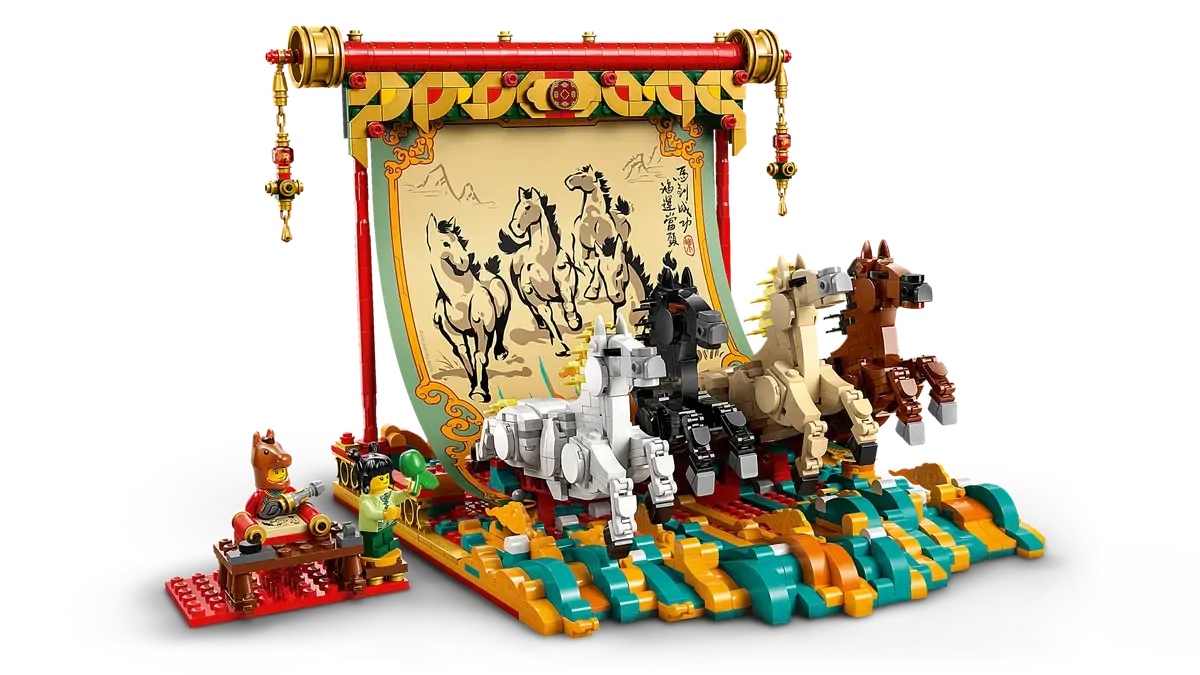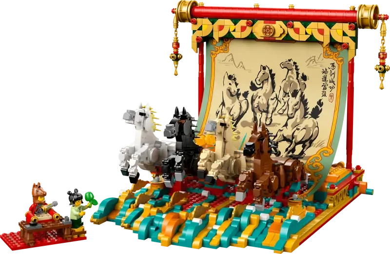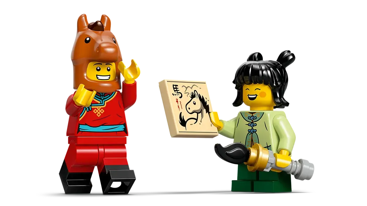 - 2 MINIFIGURES – Attach the scene featuring a painter and a person in Year of the Horse costume with a horse painting on a scroll