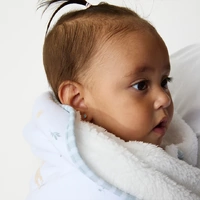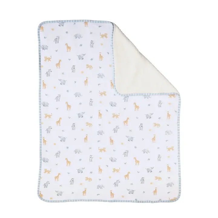 Crafted from 100% Organic Cotton Interlock Jersey and backed with plush sherpa, this pram blanket is perfect for keeping baby warm on the go.