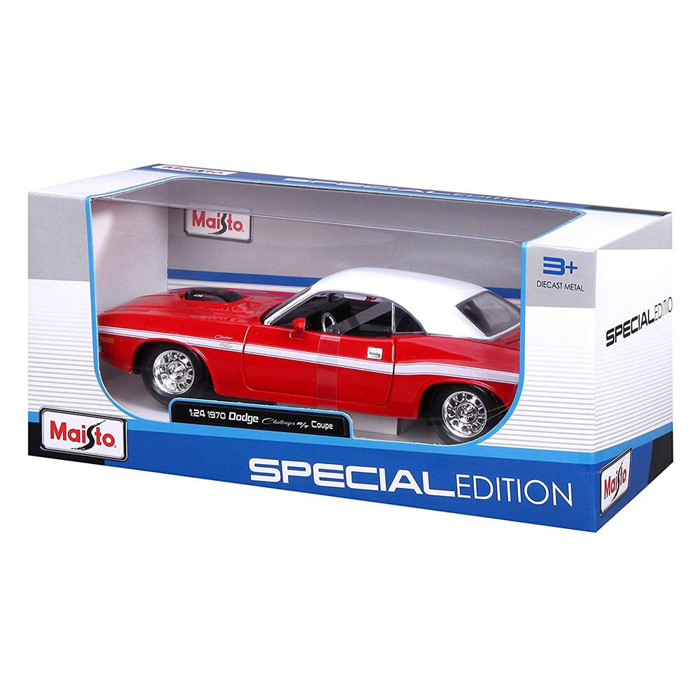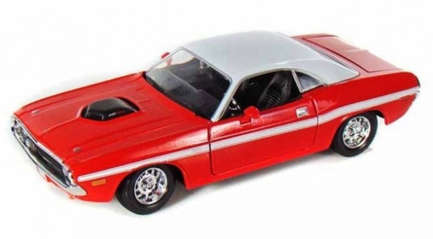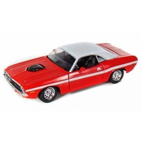 The 1970 Dodge Challenger R/T Coupe Red 1/24 Die-cast Model Car makes a stylish addition to any car enthusiast's collection. It features authentic interior and exterior details to evoke the image of the classic vehicle, as well as an opening trunk and doors. The Dodge Challenger die-cast car is suitable for play or display.