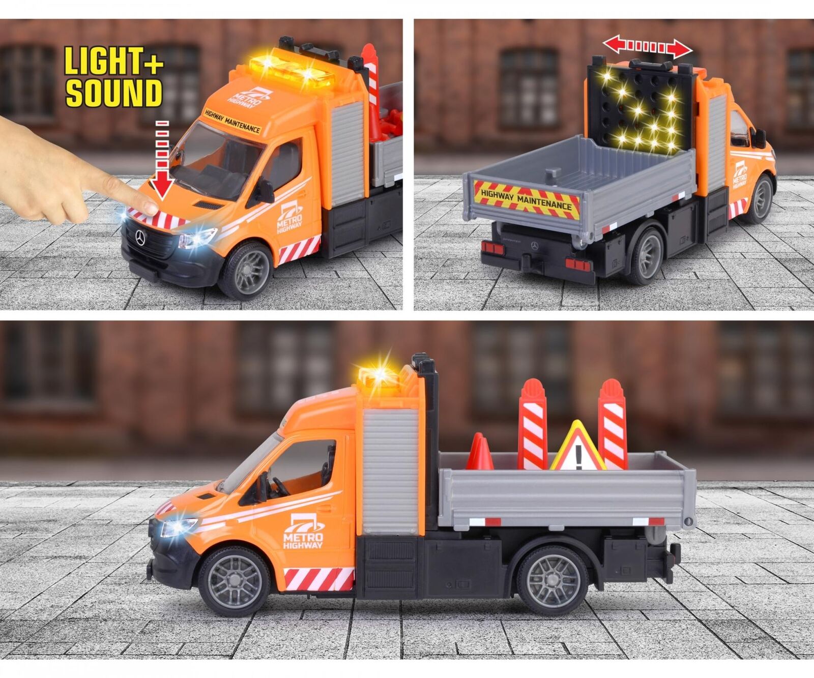 Majorette – Mercedes-Benz construction vehicle (15 cm) – Large toy vehicle with hinged loading area, light and sound effects and traffic signs, for children aged 3 and above