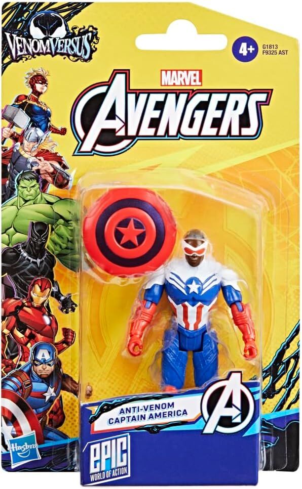 With these Avengers toys, children can create exciting venomised adventures for their favourite Marvel superheroes. Part of Hasbro's exclusive Epic World of Action series, this Marvel Anti-Venom Captain America collectable action figure features a classic design and decor as well as articulated body parts. Also included is a venomized shield accessory to make up adventures with symbiont powers. This figure in a scale of 10 cm should not be missing from any superhero collection and is a perfect gift for children. There are even more toys for boys and girls from the Epic World of Action series to collect, including figures, playsets and vehicles! (Each sold separately, subject to availability.) Copyright MARVEL. All trademarks and registered trademarks are the property of their respective owners. HASBRO and all related trademarks and logos are trademarks of Hasbro, Inc.