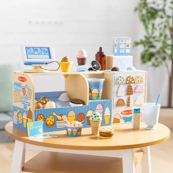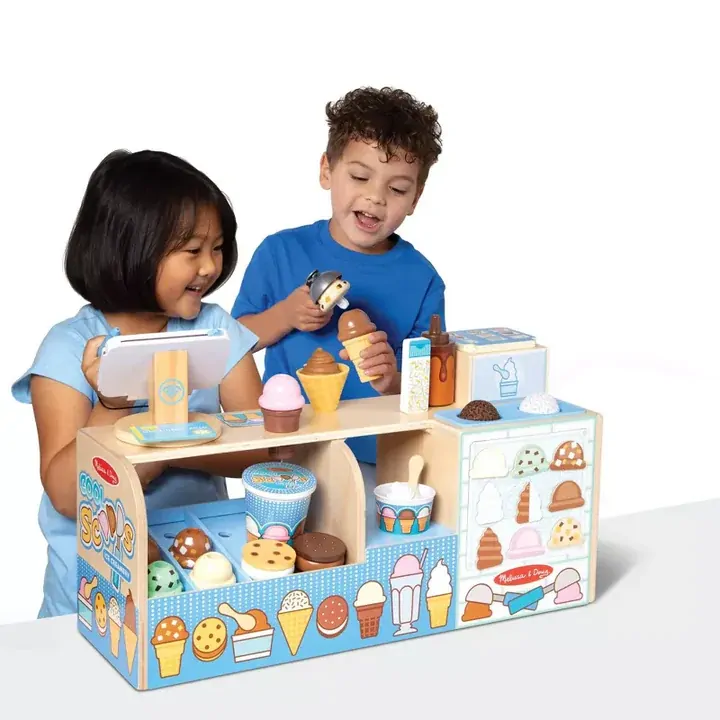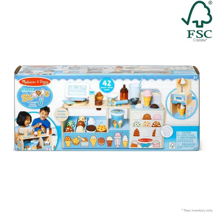Scoop up cool pretend play creations with this full-service ice cream shop! Offer pretend play ice cream and soft serve cones, cups, milkshakes, and ice cream sandwiches. The sturdy wooden counter features an ice cream and soft serve dispenser – drop wooden scoops or durable plastic swirls (mix and match!) in the top, place a cup or wooden cone underneath, press the lever, and watch the scoops drop down. Use the scooper to lift wooden scoops and fill a soft, fabric, roll-up waffle cone. Add toppings like sprinkles and hot fudge for an extra special treat! Display ice cream choices in the front of the counter. Customers can choose from items listed on the magnetic menu board and use the credit card machine with magnetic signature pad to pay for purchases! This 42-piece play food set offers kids 3 to 7 countless opportunities to develop early learning skills and to create, imagine, and role play both the customer and the server. And, grown-ups can rest assured that when it’s time to close up shop, all the pieces store in the counter for easy cleanup!