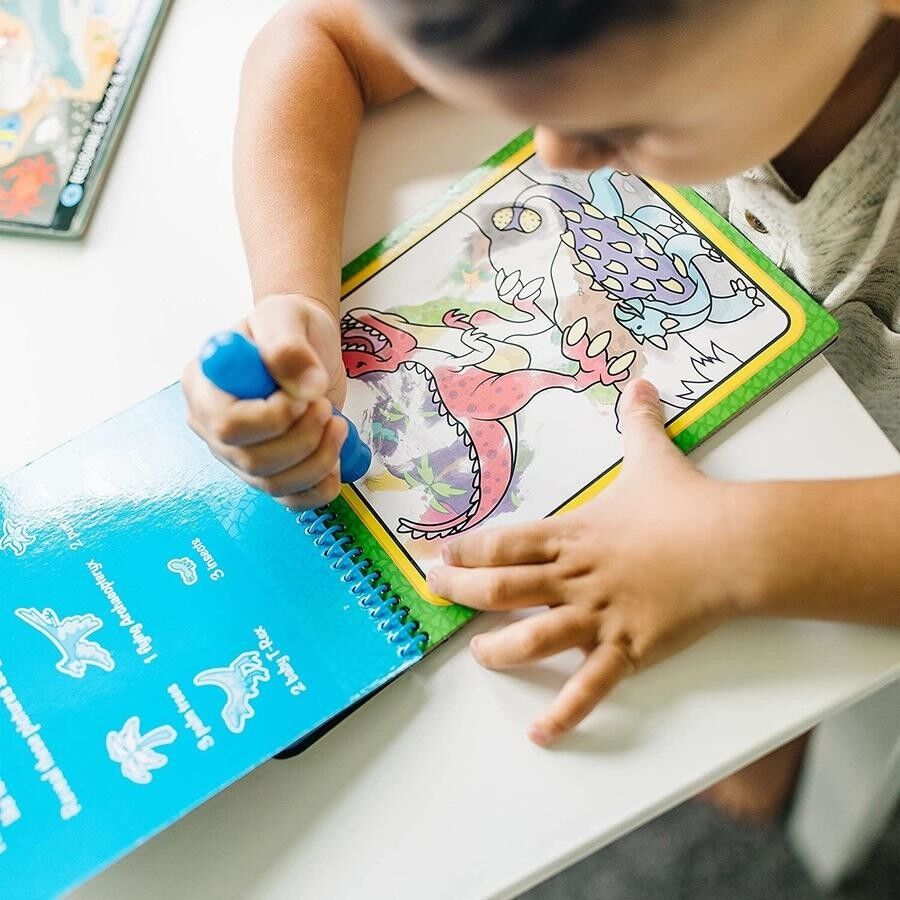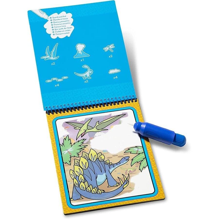 No-mess painting for kids! This exciting paint-with-water coloring book includes four reusable pages and a refillable water pen. Simply use the pen to colour in each scene-details and vibrant colour appear with every stroke! Then let the page dry to erase the pictures and colour it in again and again. This dinosaur-themed book includes four scenes to colour, and a search-and-find activity for each scene. The chunky-sized water pen is easy for kids to hold and stores neatly right in the front cover, making this Water WOW! an ideal travel activity book and travel toy for kids!