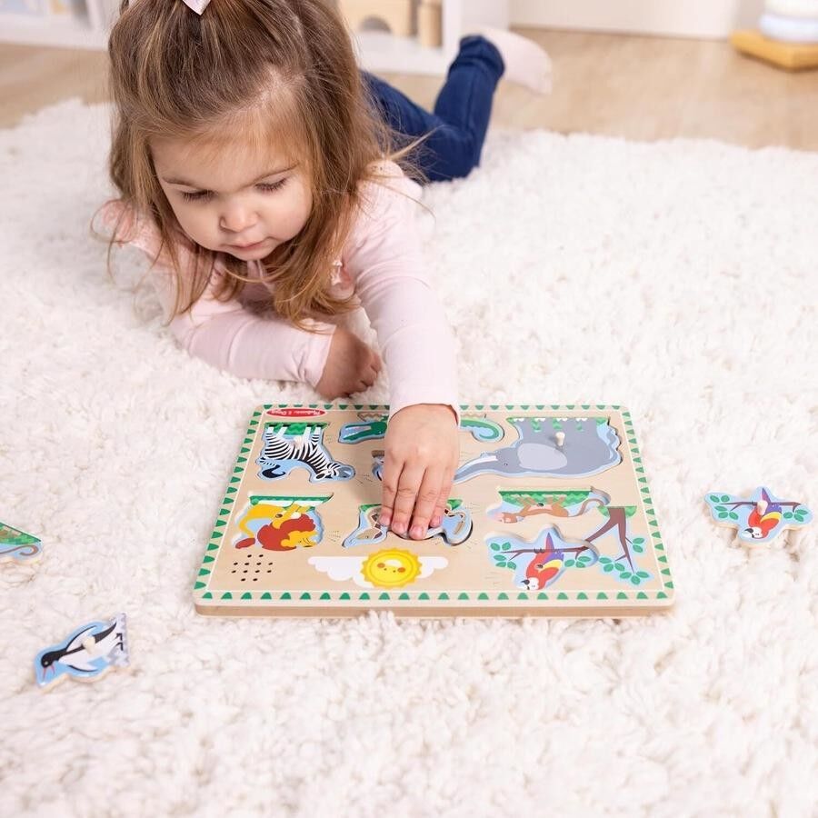 Listen to the voices of eight favourite wild animals when the puzzle pieces are correctly placed in the puzzle board! Each animal piece has a matching full-colour picture beneath. Eye and ear-catching puzzle enhances matching and listening skills.