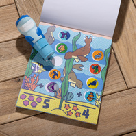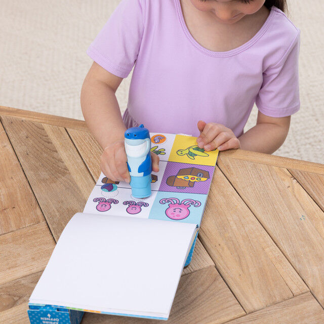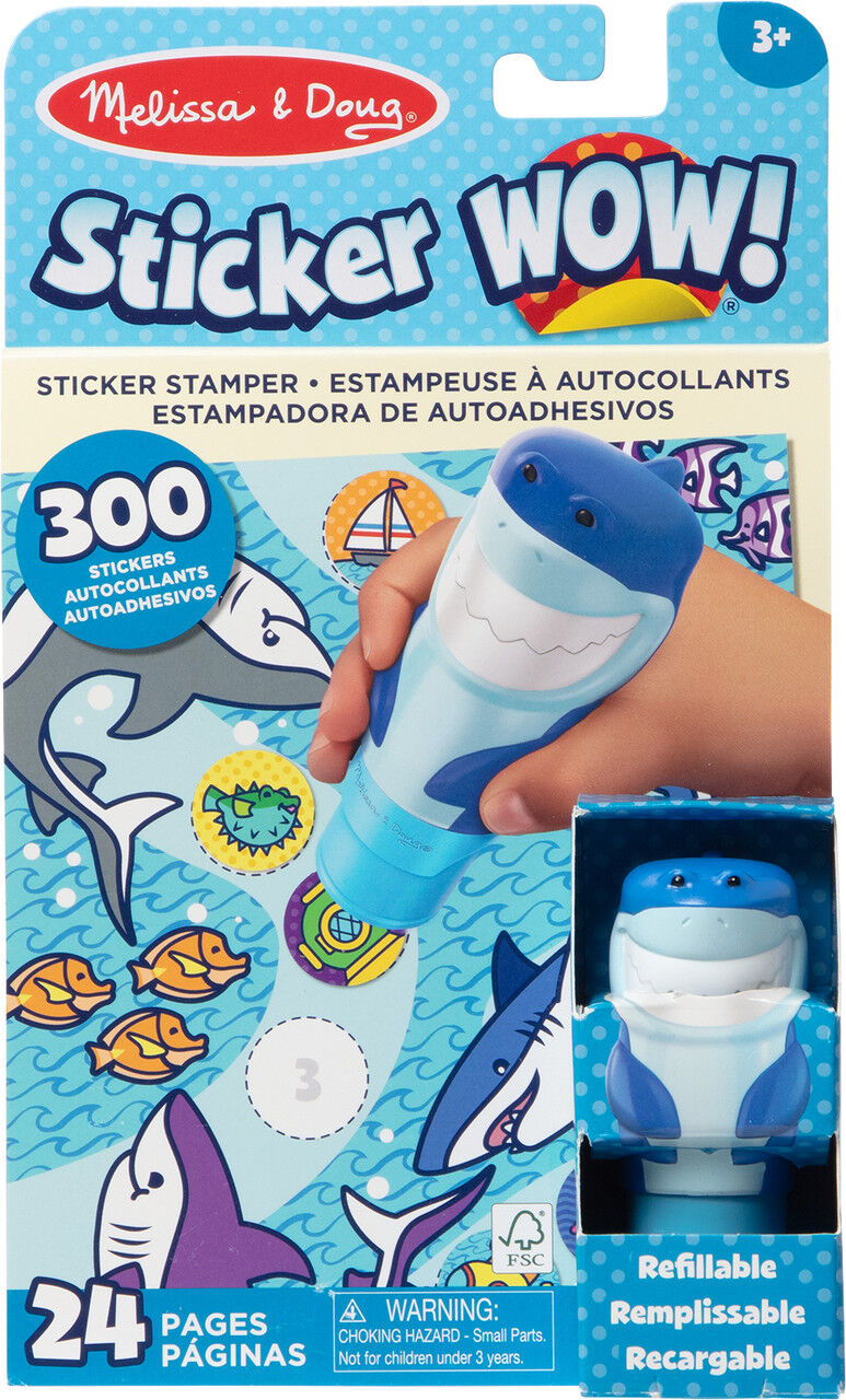 Make playtime splash with the Melissa & Doug Sticker WOW!™ Activity Pad Set – Shark, an exciting new way to enjoy sticker fun! Let the collectible Shark stamper stamp, stamp, stamp its way through 24 pages of engaging ocean-themed activities including counting, matching, and search-and-find games. Each refillable stamper comes pre-loaded with a stack of 300 assorted stickers featuring 100 unique designs — every press reveals a surprise sticker!