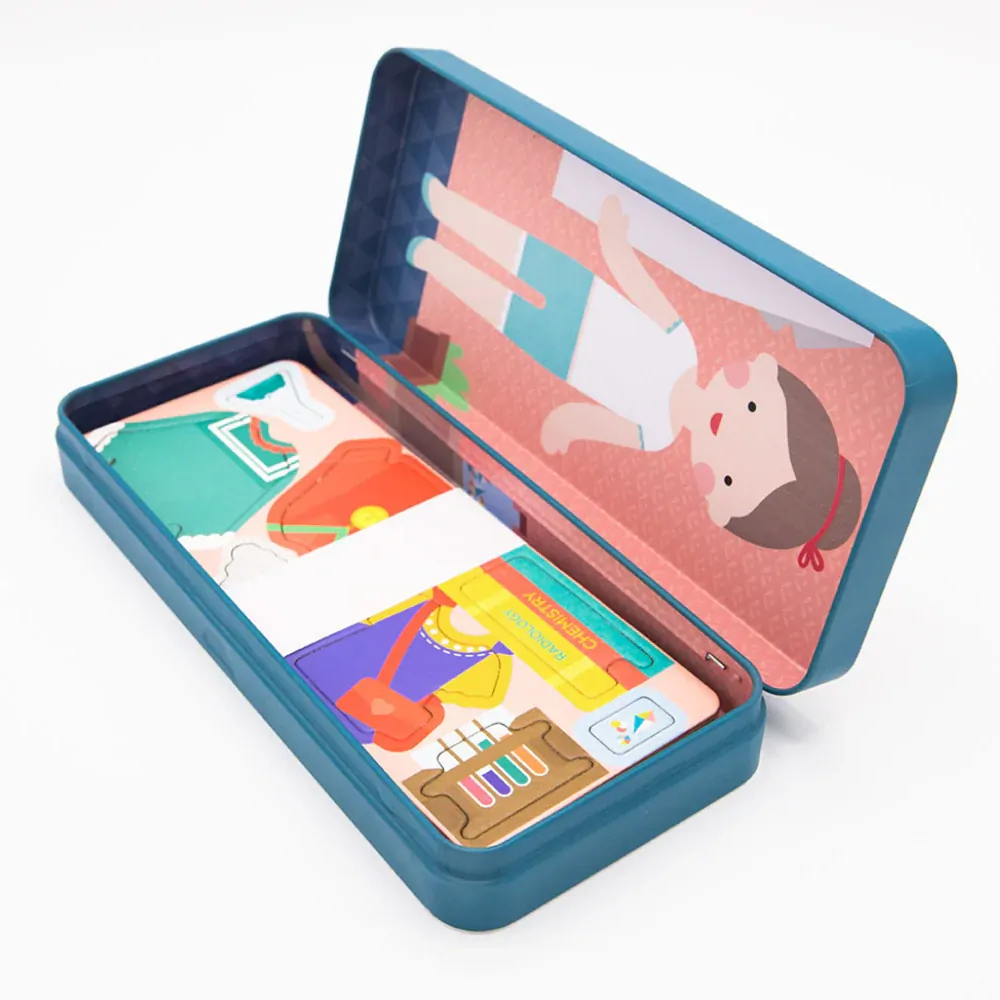 These sets include two scenes and more than 30 magnetic puzzle pieces, where they can dress up their character and invent their own stories. Using touch and feel, children can play with both hands to stimulate their left and right brain development.