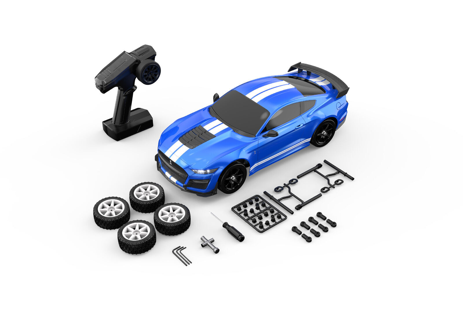 The MJX 10306 Mustang comes complete with two sets of wheels/tyres. The pre-installed tyres are designed for on-road use and the extra set for rally terrain.