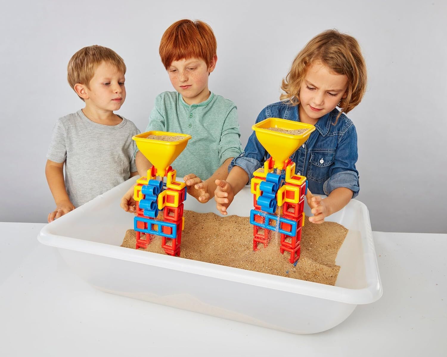 • Children can funnel sand, seeds, grains or water through the hopper to set the spinner in motion
