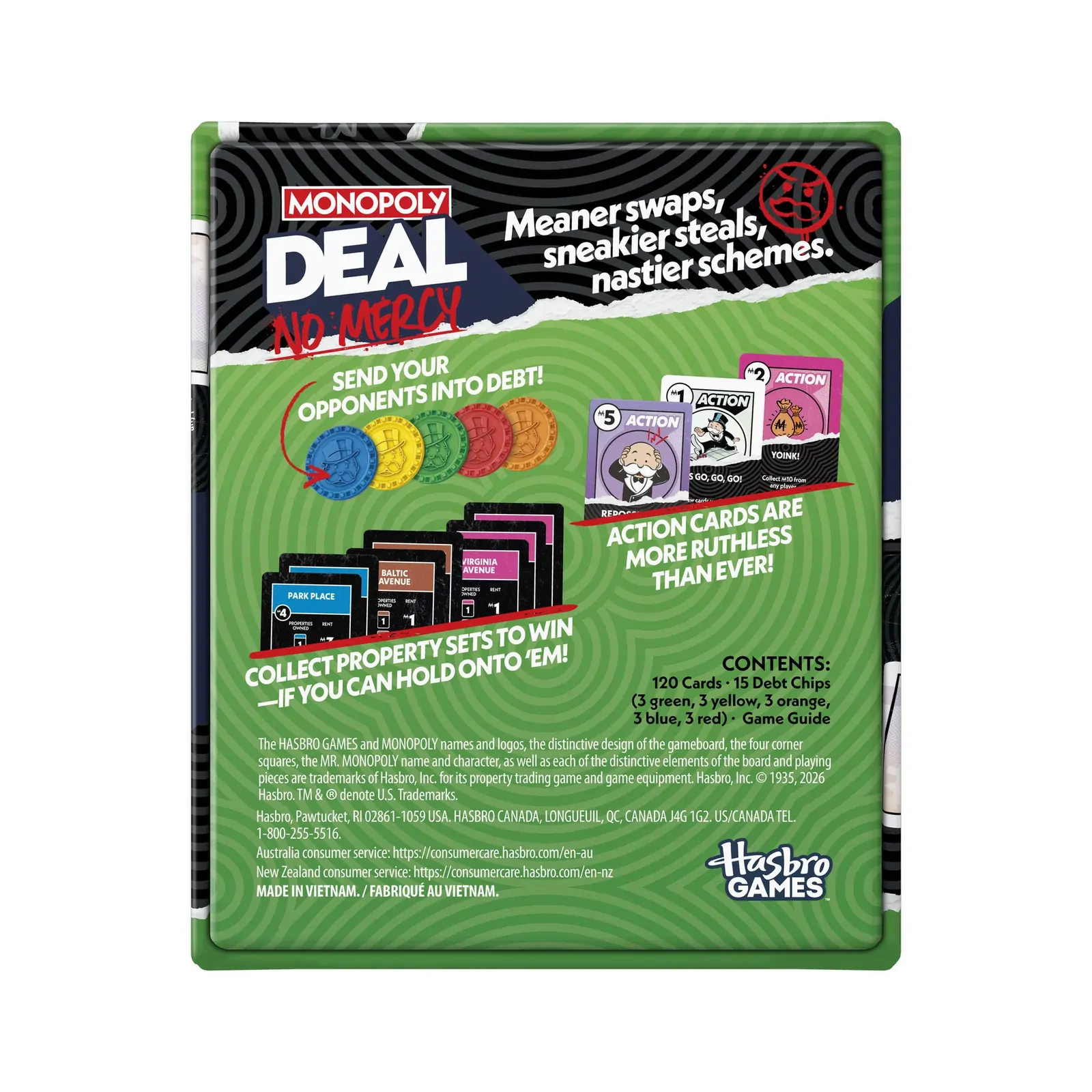 Action cards are meaner than ever—charge double rent, steal sets, and even take an opponent’s Bank. Can’t pay? Hand over a debt chip and repay with one of your cards. Perfect for game nights, parties, or on-the-go fun!