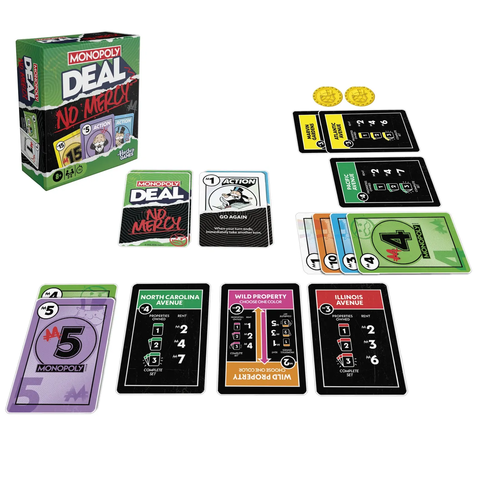 Get ready for the most ruthless Monopoly Deal yet with Monopoly Deal No Mercy! Swap, steal, and scheme your way to victory as you compete to collect 3 property sets first.