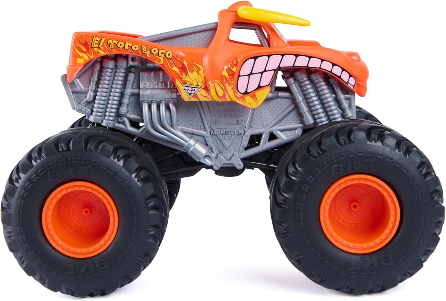 Rev ‘em up and watch ‘em ROAR! Introducing the all-new, Rev ‘N Roar 1:18 scale, authentic Monster Jam trucks! Rev your El Toro Loco forward or backward and watch it go! Listen to the iconic sound of Monster Jam monster trucks as your Rev ‘N Roar comes to life! These loud machines feature 4-wheel drive, official BKT rubber tires, and tons of detail, making sure these powerful trucks can run over anything AND look good doing it! Featuring a powerful, internal driving system, these monster trucks can smash, crash, and bash like never before! Add to your epic Monster Jam collection with the all-new, Rev ‘N Roar Monster Jam truck!