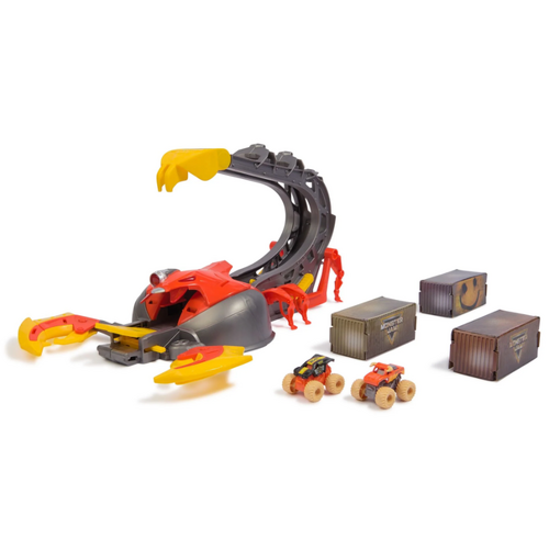 • Includes: 1 Monster Jam Mini Jams El Toro Loco Truck, 1 Monster Jam Mini Jams Max-D Truck, 1 Scorpion Power Launcher, 1 Scorpion Tail, 1 Left Back Leg, 1 Right Back Leg, 4 Small Legs, 3 Fold-up Containers, 1 Left Pincer, 1 Right Pincer, 1 Jump Ramp