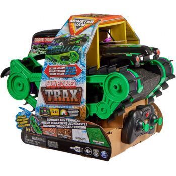 Attack any terrain with the new Monster Jam Grave Digger Trax. Being the fastest Monster Jam land-and-water RC vehicle puts you in control of epic Monster Jam action on any terrain, including dirt, rocks, snow and even grass. The unique design with the all-terrain tank treads allows you to float and travel through water, and you can use the dual-joystick controller up to 45m away.