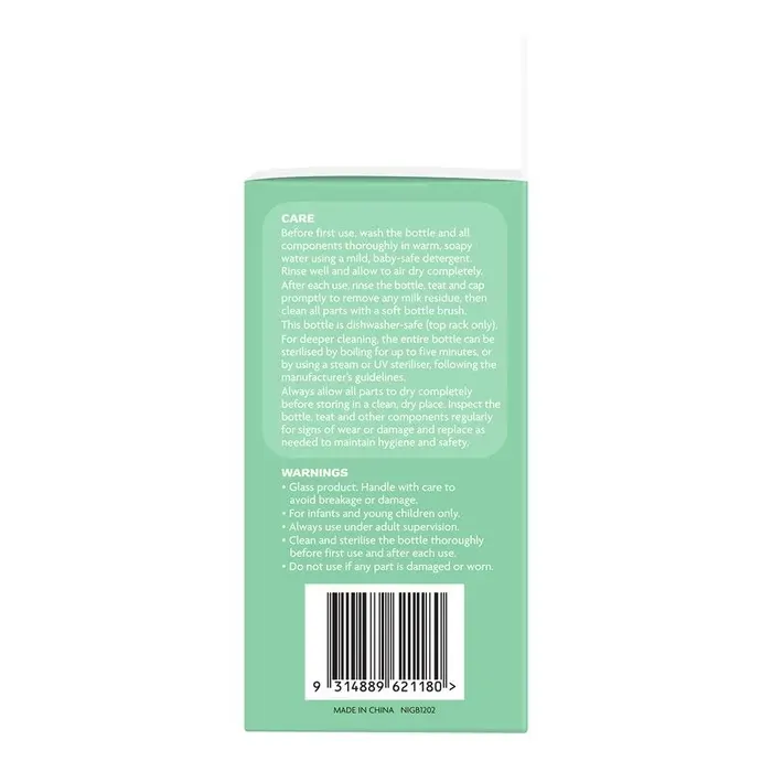 • Borosilicate glass (bottle), food-grade silicone (teat), BPA-free, microplastic-free