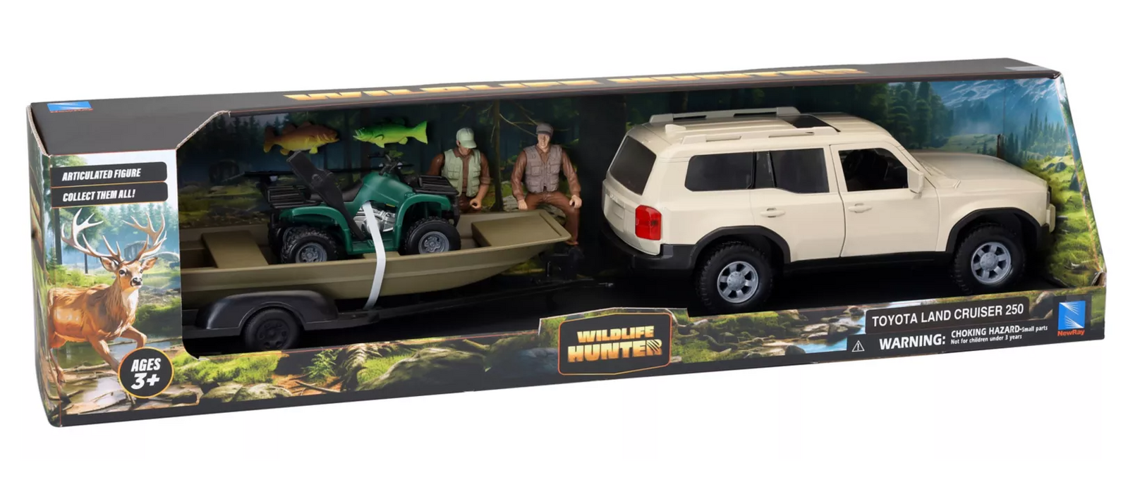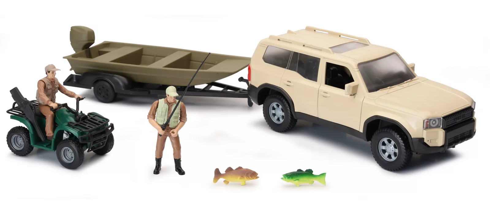 For those who love Wild Life and outdoor themes. This set includes a Toyota vehicle hauling a Jon Boat with figures and some fishes. Suitable for ages 3 years old and up.
