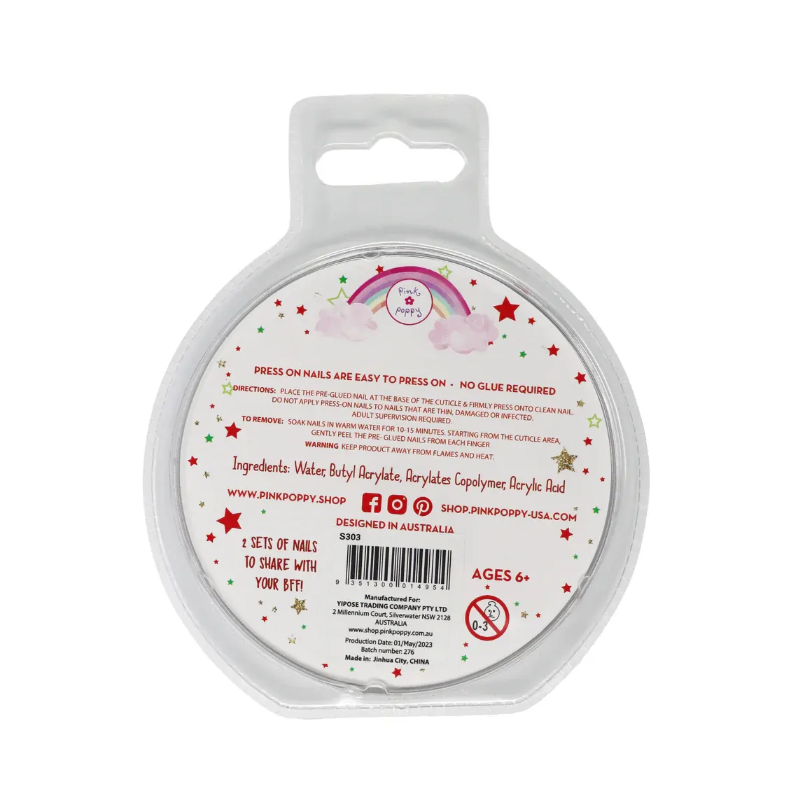 Pink Poppy's Festive nails are a great finishing touch for the holiday season. The cute Santa and snowman designs are sparkling with red and white glitter. They come with an adhesive back, so they are easy to press on with no glue required! Place the pre-glued nail at the base of the cuticle and firmly press onto the clean nail for an instant makeover. No mess, no dry time. The pack comes with 20 nails for 2 applications or to share with your bestie.