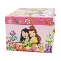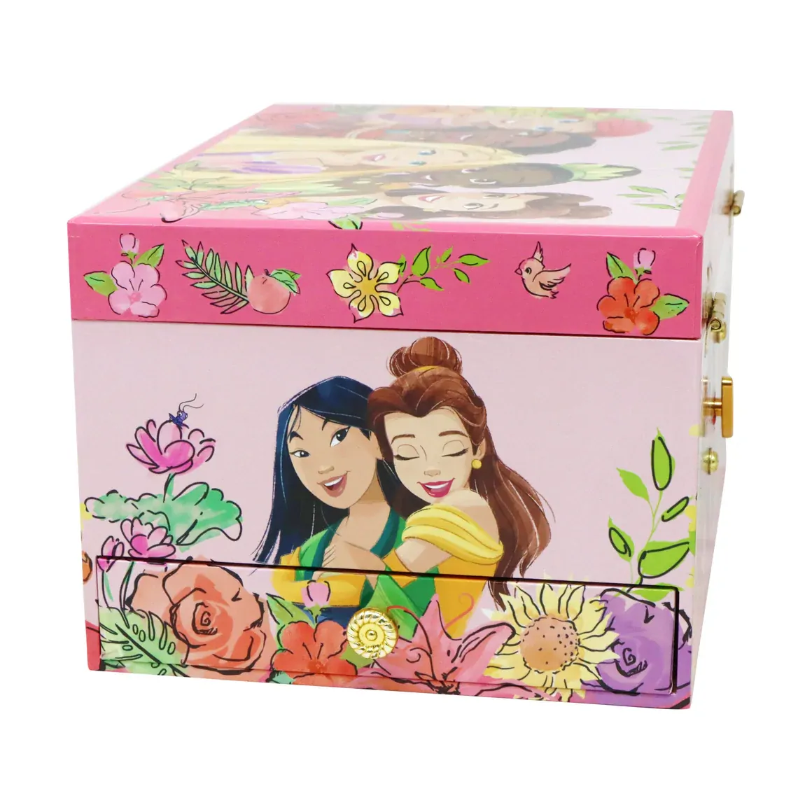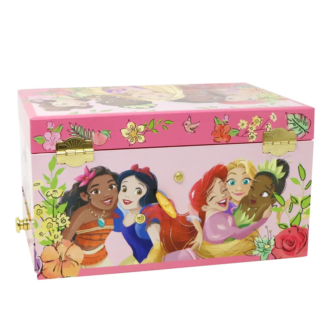 Inspired by ©Disney Princess, The perfect gift for Disney Princess fans. This Disney Princess Forever friends Luxury Musical Jewellery Box features a flocked lining interior to protect her precious jewellery. It has 2 side draws, a ring compartment, a divided jewellery compartment, a mirror & a rotating printed heart figure that spins to the tune of 'Sleeping Beauty.