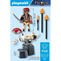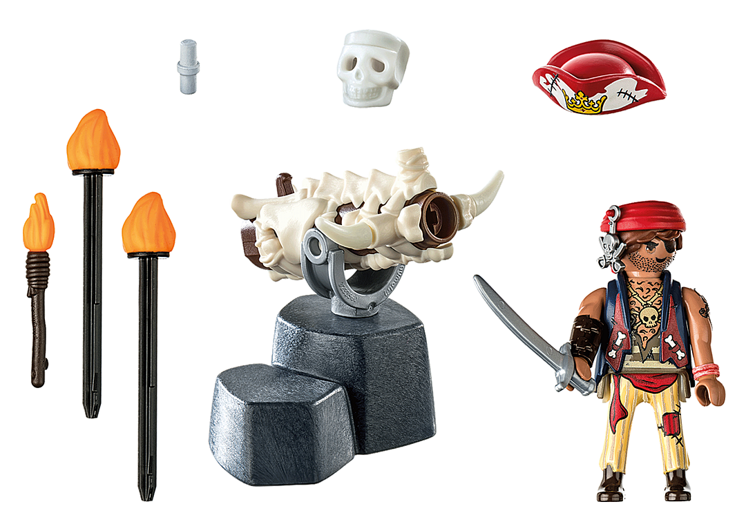 Beware, ye landlubbers! The fierce pirate loads his bone cannon and drives away all attackers and sea monsters with his fiery projectiles. A fantastic playset for all pirate fans aged 4 and up. The bolt cannon is mounted on a rock and can be rotated and swiveled. Bracelets, leather cuffs, and a headband can be removed from the figure.