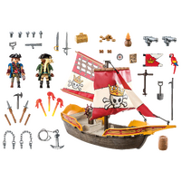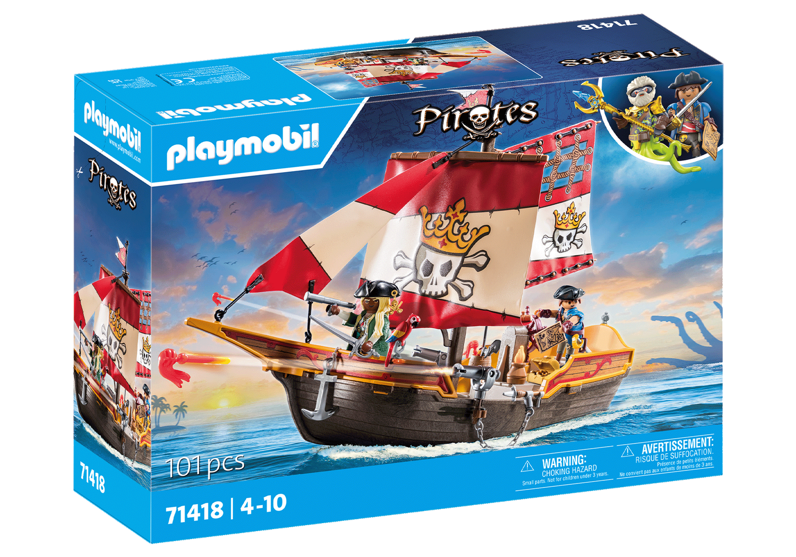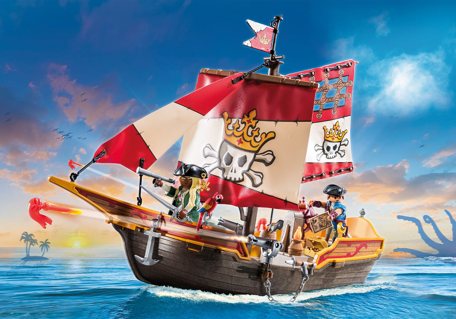 Command the seas with the PLAYMOBIL Pirate Ship, a fully floatable vessel designed for epic maritime adventures. This meticulously crafted set features rotating and pivoting cannons for tactical gameplay, adjustable sails for dynamic positioning, and five secure foot clamps to keep figures steady on deck. Includes two detailed pirate characters—Manta-Hunter Myles and Pirate Queen Rohanna "Ro" Razor-Tide—plus a parrot, compass, treasure map, anchor, and authentic accessories. The ship's sturdy construction supports imaginative storytelling, from treasure hunts to naval combat scenarios. Compatible with optional underwater motors for expanded play possibilities. Ideal for pirate enthusiasts aged 4 and up seeking immersive, long-lasting entertainment.