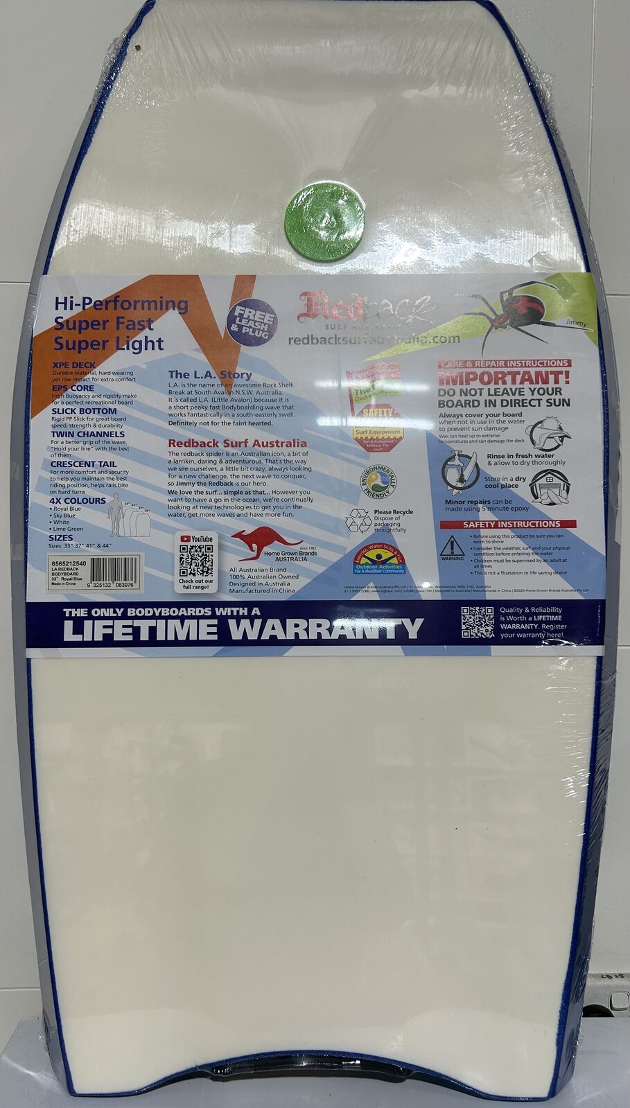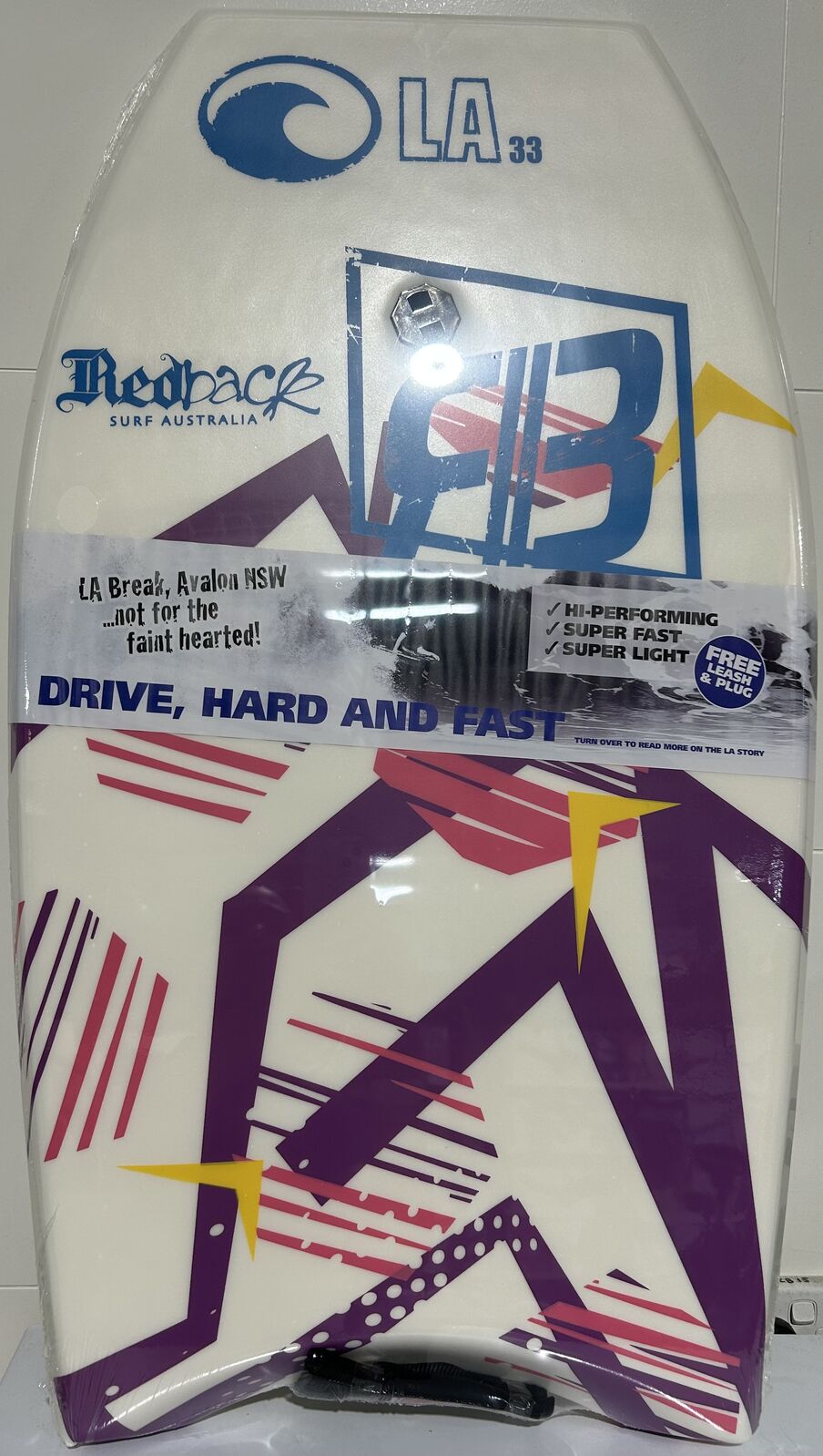 The LA Body Boardfeatures: Twin Channels, better grip on wave, greater speed and control. Crescent Tail. Comfortable riding. Slick Bottom. Great board speed. XPE Deck. Hard wearing yet low impact. EPS Core. High Bouyancy & rigidity.