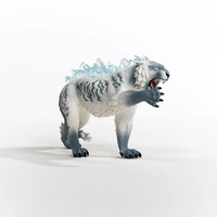 Schleich’s Ice Tiger is a wild Eldrador creature living in icy caves and crags of glacial areas. This beastie is sculpted in a striking pose, with its from right paw extended in attack, while its other three icy paws are on the ground. Its body is covered in white fur with blue grey stripes and colouring on its limbs, face and top of its tail. Protruding along the ridge of its back are semi-translucent icicle spines, while its face is snarled, highlighting its magical icy eyes, and its vicious open mouth which is roaring and showing its sharp and ferocious teeth to its opponent, sure to scare them off.
