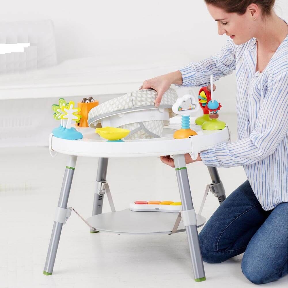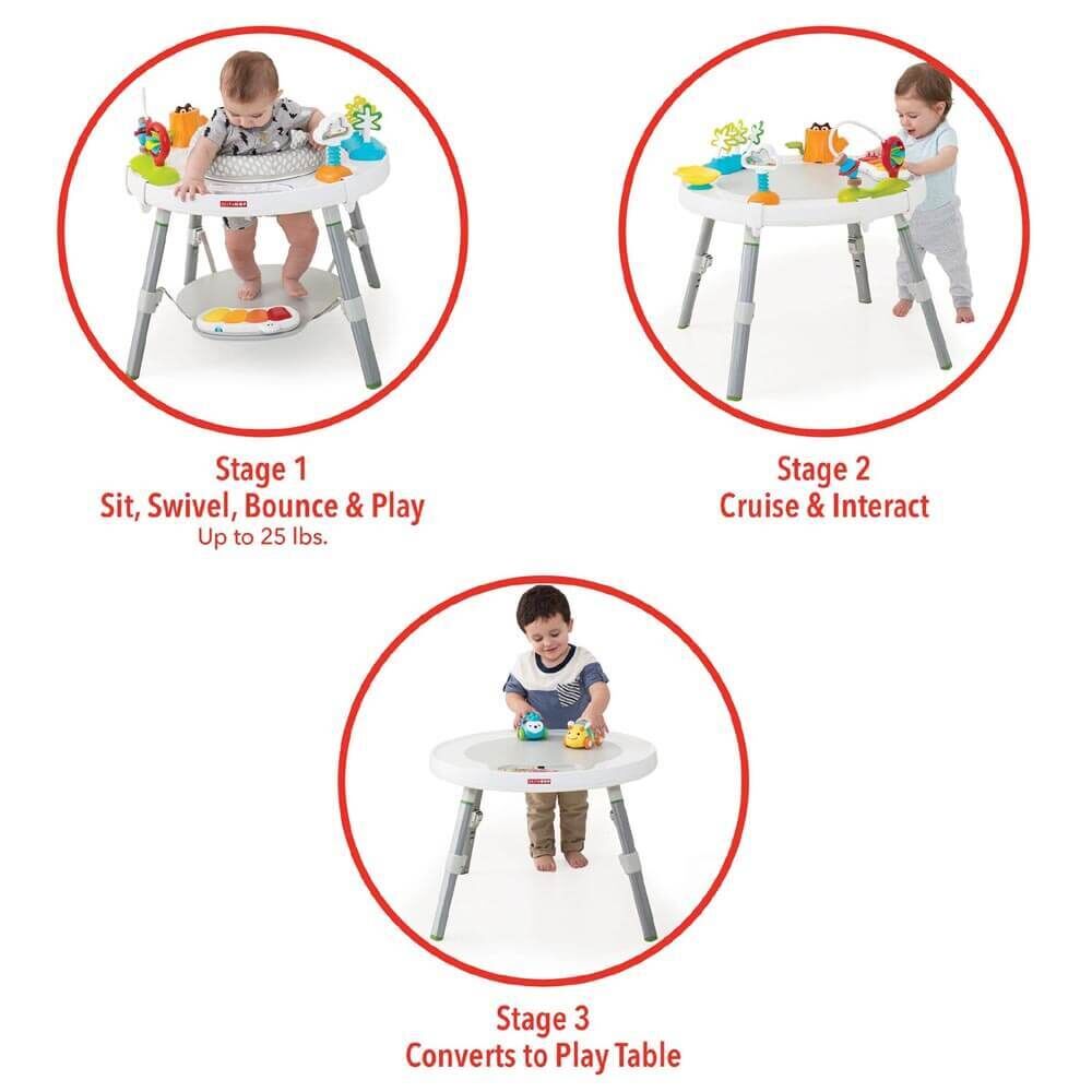 • Three stages of use: Sit, swivel, bounce & play, Cruise & interact, Play table