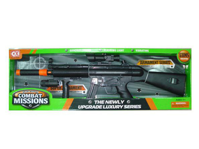 Includes gunshot sound, flashing light and vibrations.