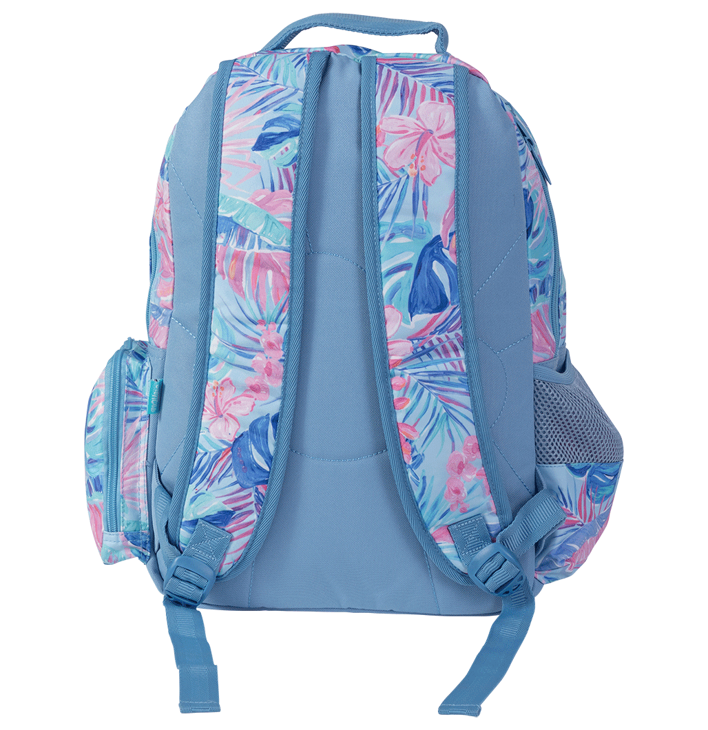 This Big Backpack sports a water bottle compartment, side zip compartment perfect to hold a phone, inner padded pocket for a laptop/tablet and D-loop and lobster clips for bag tags and clipping coin pouches and wallets. This bag is both super cool AND practical.
