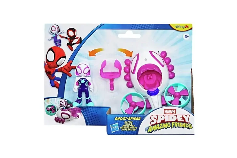 Race in to save the day alongside Team Spidey with this Marvel Spidey and His Amazing Friends Ghost-Spider Copter action figure and vehicle set! This awesome toy vehicle comes with a poseable 3-inch (7.6 cm) Ghost-Spider toy that fits inside, so kids can imagine soaring into action and adventure. For even more fun, attach the included character-inspired capture accessory to either the vehicle or the Ghost-Spider figure and imagine baddie-catching excitement! Encourage big, imaginative, adventure play for kids ages 3 & up with these Marvel toys for boys and girls, featuring design inspired by the Disney Jr. series Spidey and His Amazing Friends! Look for even more Spidey and His Amazing Friends toys, including Miles “Spin” Morales with Techno-Racer race car toy and Spidey with Web Crawler car, as well as playsets and accessories, to build a Super Hero web-slinger collection or give as cool Marvel gifts for preschool kids! (Each sold separately. Subject to availability.)