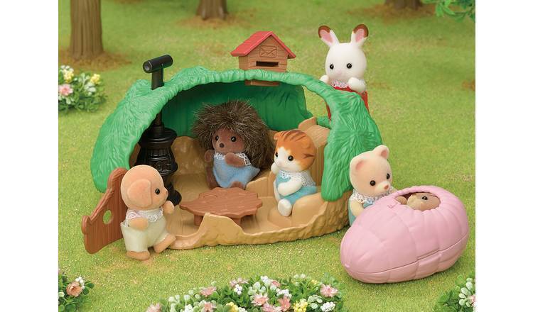 Baby Hedgehog Hideout is a secret hedgehog motif house for a Hedgehog Baby. The Hedgehog Baby fits snugly into the sleeping bag. Inside the hideout is a slide, a hedgehog-shaped table, and a stove.