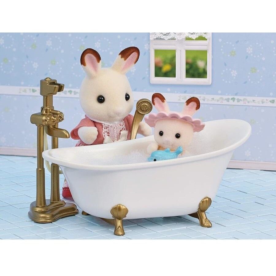 Furniture set with antique-style bath and shower fitting. Includes shampoo, soap, bath toy, shampoo hat, and other bath time accessories. Use the included tile floor to add more detail to your bath time scenes. Shampoo Hat fits baby figures. The shower curtain can be opened and closed.