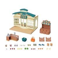 The Grocery Market features a checkout counter and shelving and comes with plenty of ingredients. A shopping basket is also included, allowing for more fun while shopping. The ingredients on top of the counter can be moved into the bag by sliding the bar on the cash register and the walls and flooring of the shop can be detached.