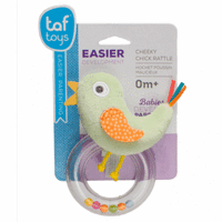 The Taf Toys Cheeky Chick Rattle isa baby toy designed to engage and develop a child's senses and fine motor skills. It features a plastic ring for easy gripping and fun rattling sounds. The toy also includes a soft, plush chick character and textured elements like a ribbon tail.