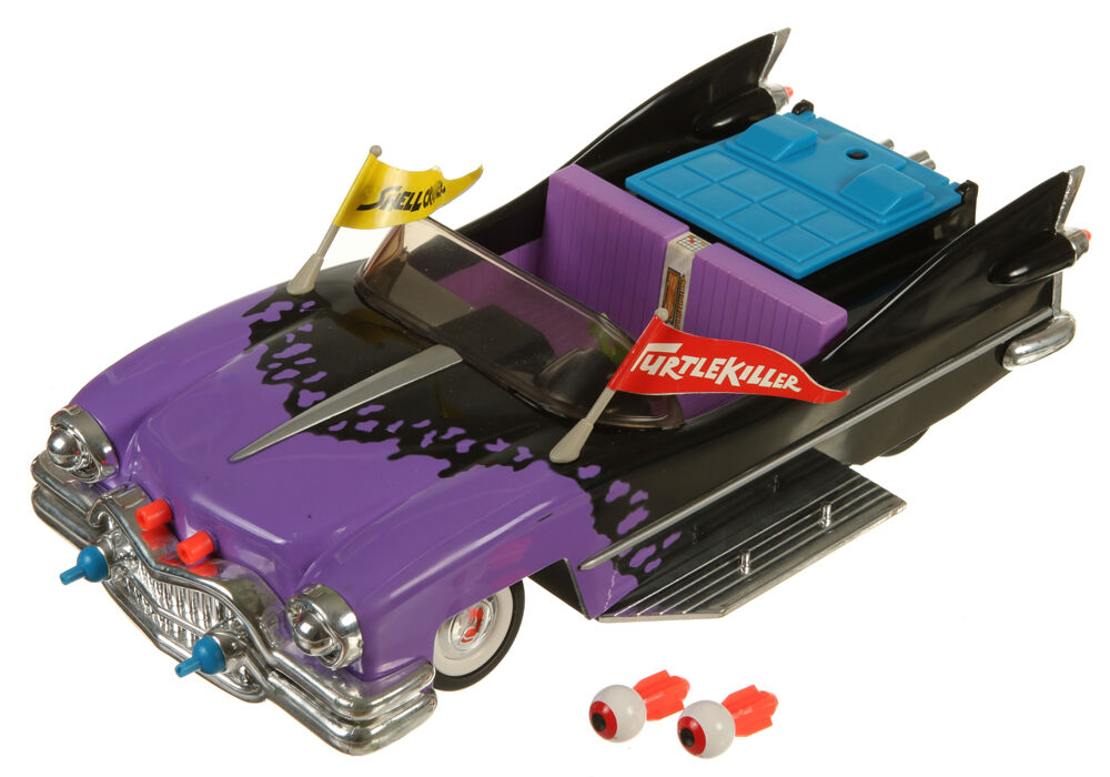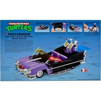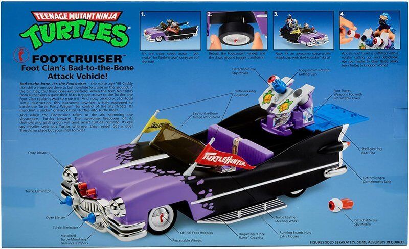 Bad to the bone, it's the Classic Footcruiser! The Space Age '59 Caddy that shifts from overdrive to techno-glide to cruise on the ground, in the air—hey, this thing goes everywhere! When the teen Neutrinos from Dimension X gave their hi-tech space cruiser to the Turtles, the Foot Clan couldn't wait to snatch it! And now, tricked-out for total Turtle destruction, this loathsome lowrider is fully equipped to battle the Turtles for control of the city streets. And when the Footcruiser takes to the air, skimming skyscrapers, Turtles beware! The awesome firepower of its shell-piercing gatling gun will send smart Turtles scurrying!. Its eye spy missiles seek out Turtles wherever they reside, so get a clue! There's no place but your shell to hide!