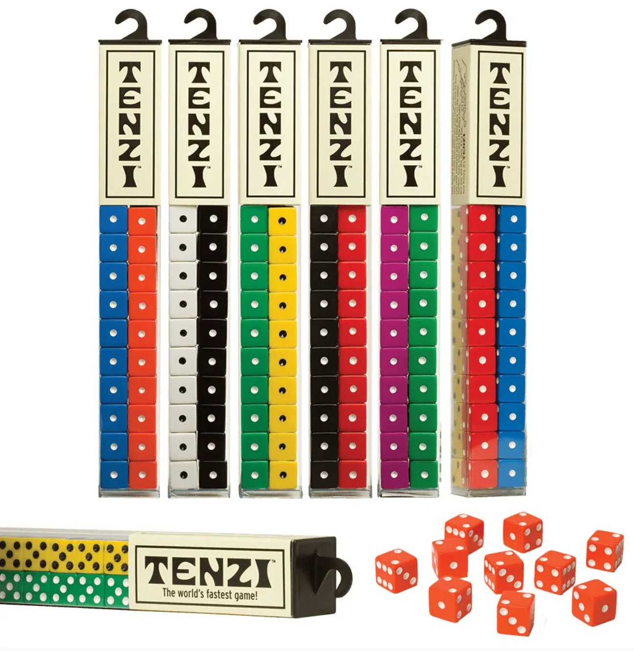 Each player chooses a set of dice. Players hold all ten dice in their hands. Someone says “Go” and everyone rolls at the same time. Quickly look at your roll and decide which number you are going to go for. (For example, if you have more 3’s than any other number, that’s what you want to go for.) Put all your dice with that number aside, collect the remaining dice and quickly roll again. (You do not have to wait for others to roll again. Everyone rolls together only on the first roll.) Keep rolling until all ten of your dice show the same number. Be the first player to get all ten of your dice to show the same number, shouts out “TENZI” and win the game.