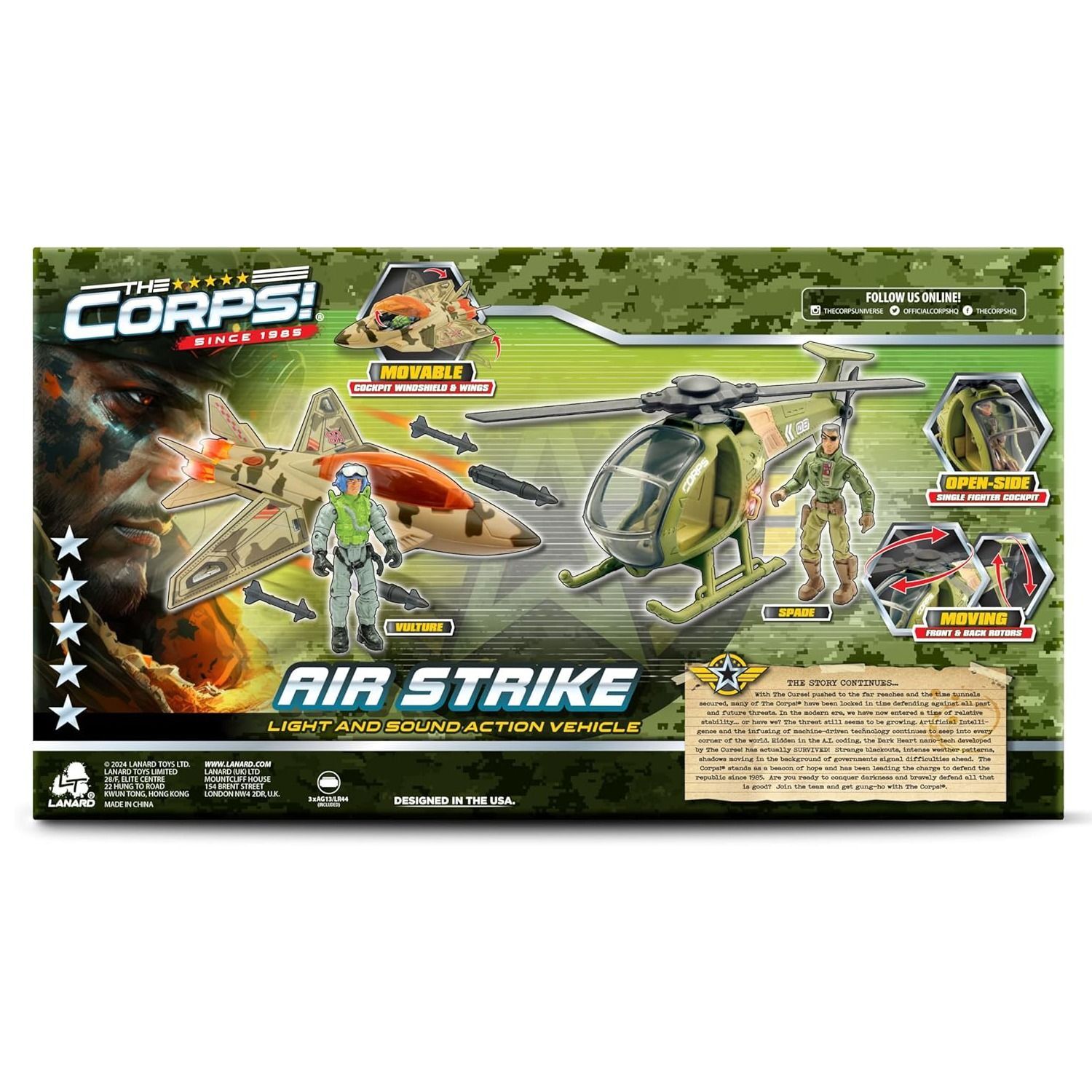 The Corps! Air Strike Action Jet Fighter is the perfect addition to any collection for the action figure enthusiast. Create exciting battle scenes and launch operations that you control! Press the button to get realistic jet engine take off sounds and light up red flashing engine exhaust details. Retracting wings and landing gear, opening cockpit canopy and snap-on missiles complete this action-packed Jet Fighter!