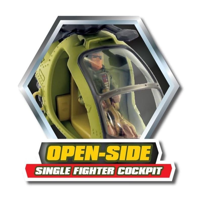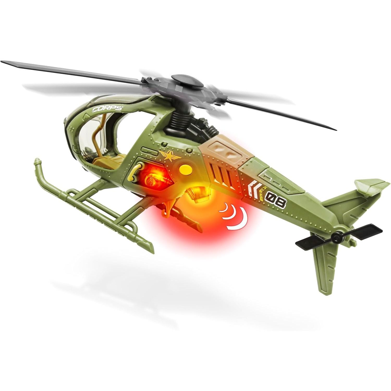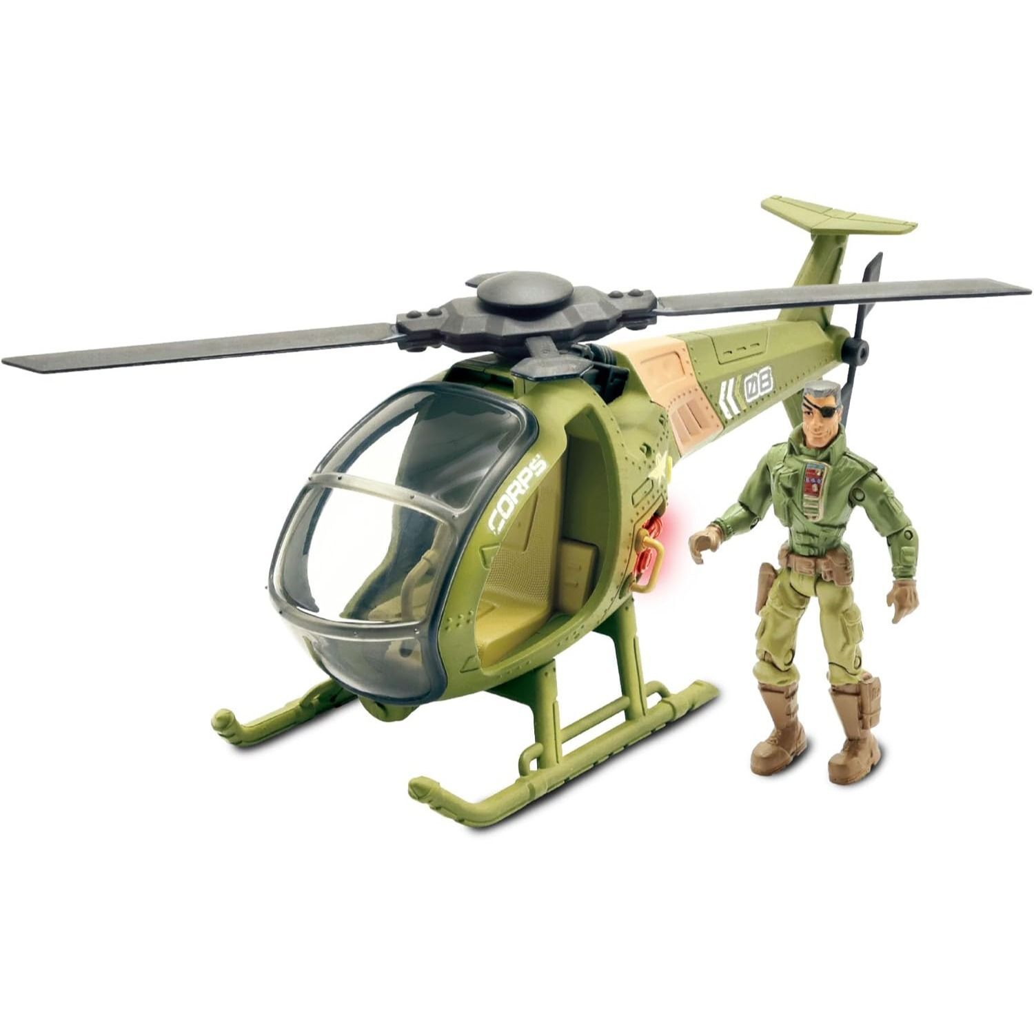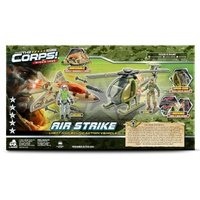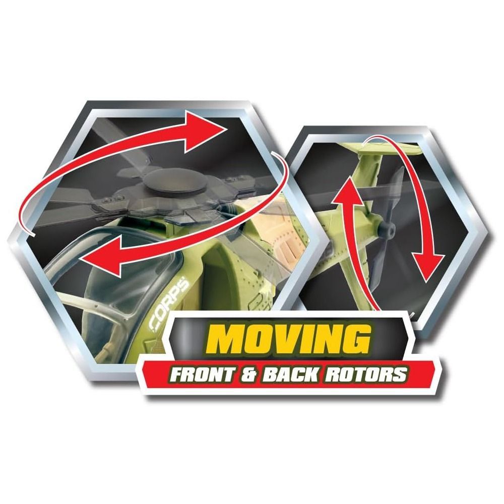 The Corps! Air Strike Action Helicopter is the perfect addition to any collection for the action figure enthusiast. Create exciting battle scenes and launch operations that you control! Press the button to get realistic helicopter sounds and light up red flashing engine details. Spinning front and back rotors, open side single figure cockpit and hideaway cargo hook complete this action-packed copter!