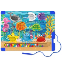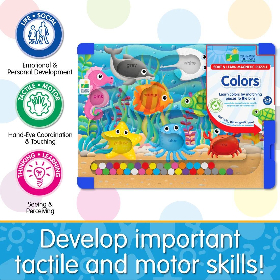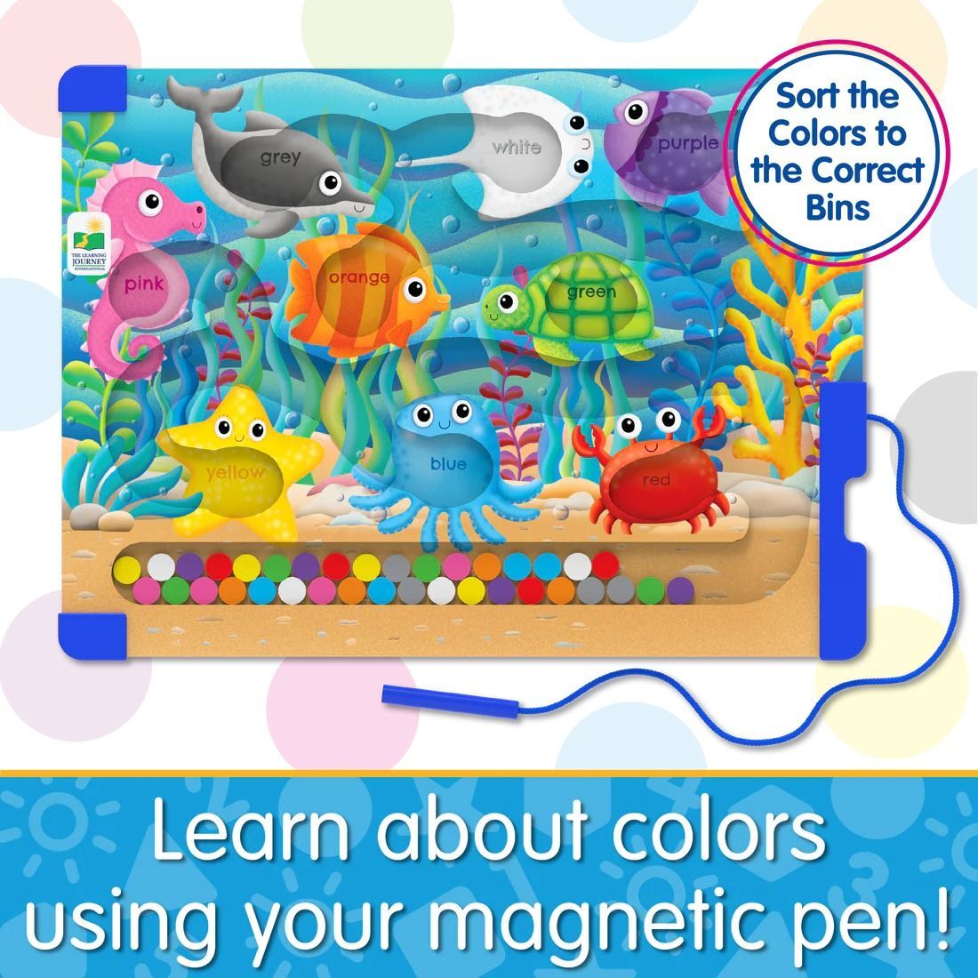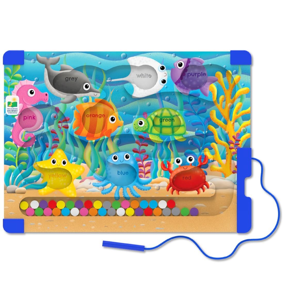 This fun and colourful hands-on “sea life” magnetic tray puzzle helps children to learn their colors in a fun and engaging way. Learn the basic colors by using your magnetic pen and placing all the corresponding-colored magnetic pieces to their proper color bins. Once complete, simply turn the puzzle over and watch the colour magnetic pieces fall back into the collection area at the bottom of the puzzle.