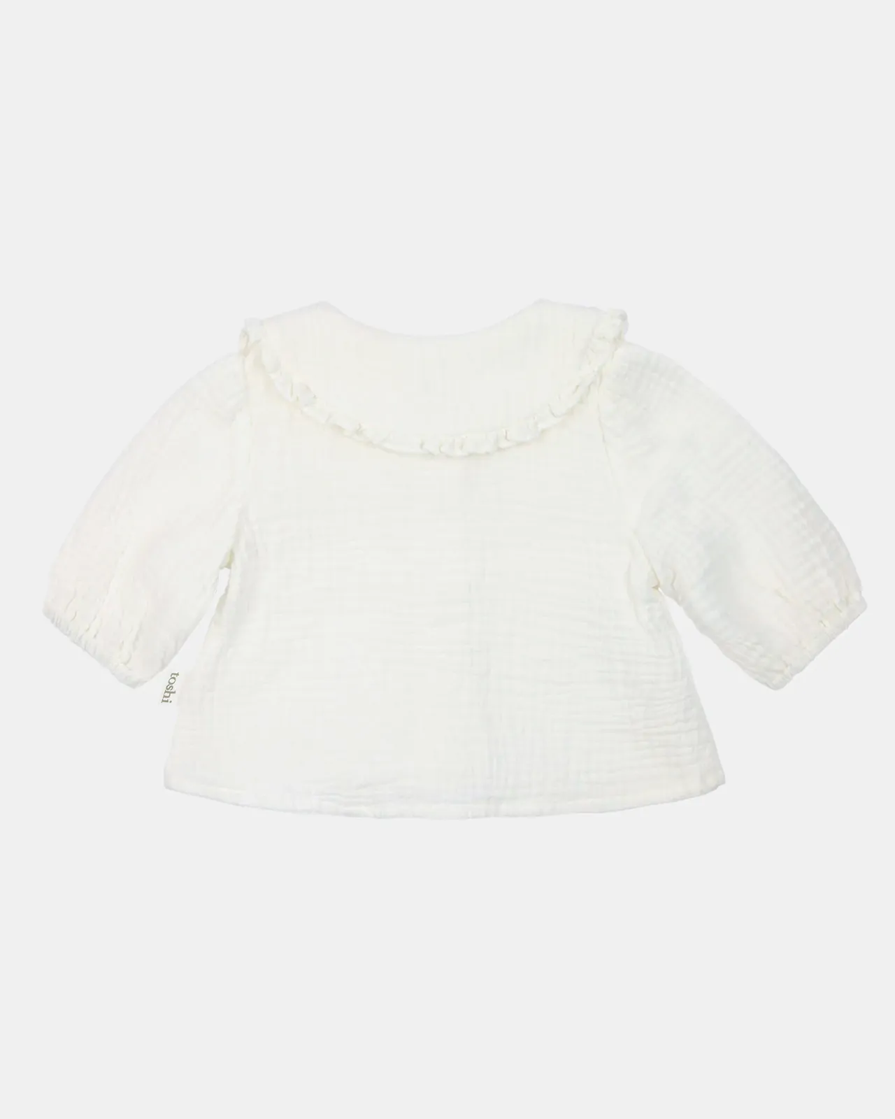 Introducing Toshi Baby Blouse Peter Pan. The Toshi blouse is crafted from 100% cotton cheesecloth fabric, offering gentle warmth and comfort with its nurturing texture.