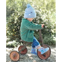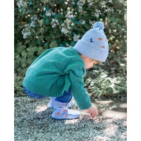 The beautifully textured melange yarn introduces an element of natural refinement. The Toshi beanie is embellished with a playful and original embroidery design. A feature pompom creates a cute and whimsical feel. The roll up ribbed border offers versatility of styling and increased protection from the elements. The baby Beanie Mystical is fully lined with 100% organic cotton.