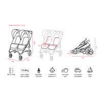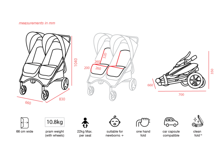 The Slim Twin Stroller is designed with urban spaces in mind. At less than 66 cm wide, this lightweight double stroller will fit through even the narrowest doorways.